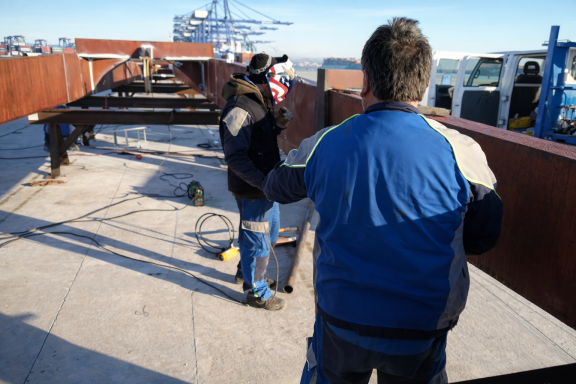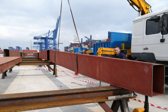 •On-quay assembly and welding of boom sections
