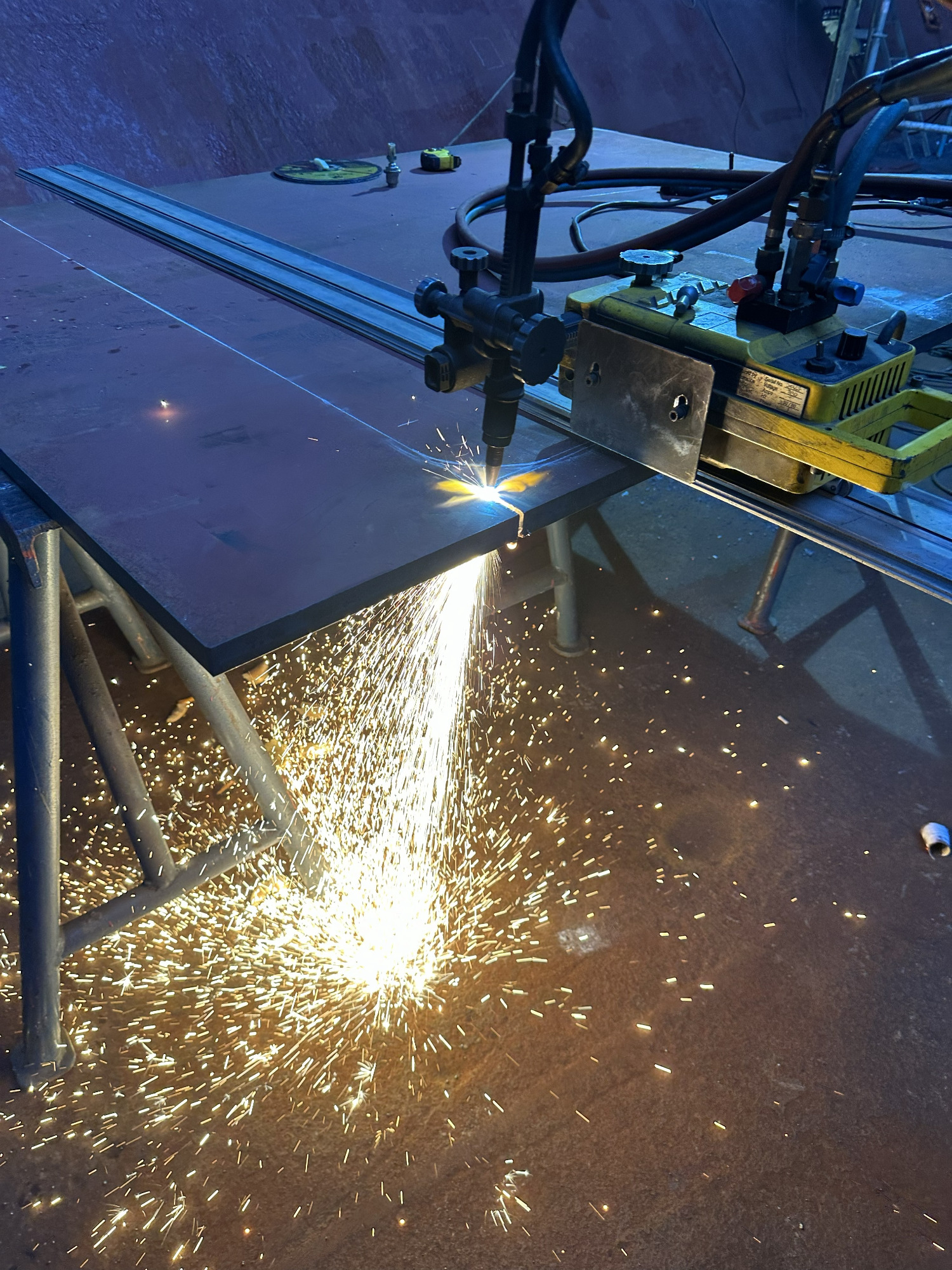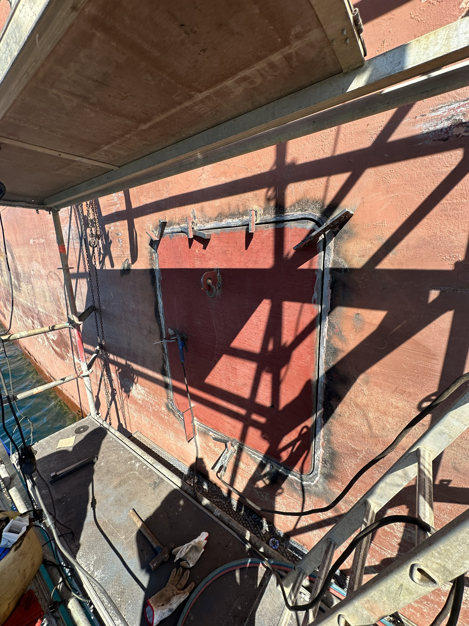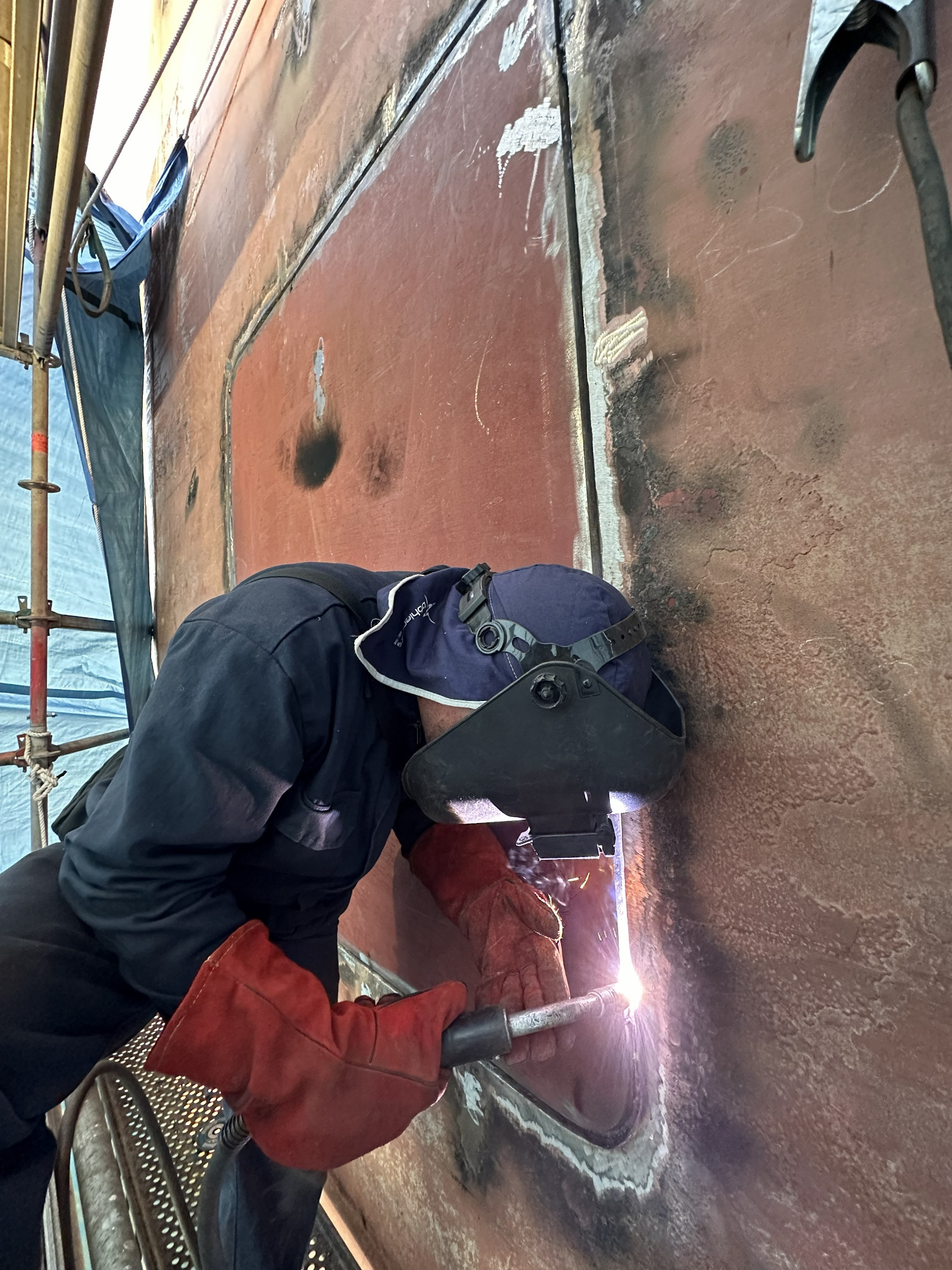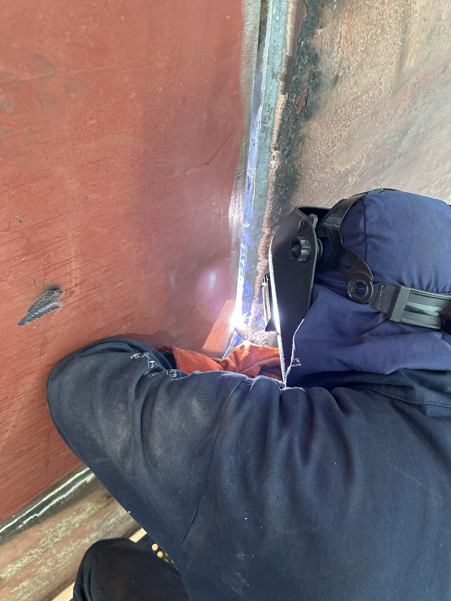 The scope included cutting, preparation and welding of a 15 mm thick steel plate, executed under confined space conditions and in compliance with marine safety procedures.